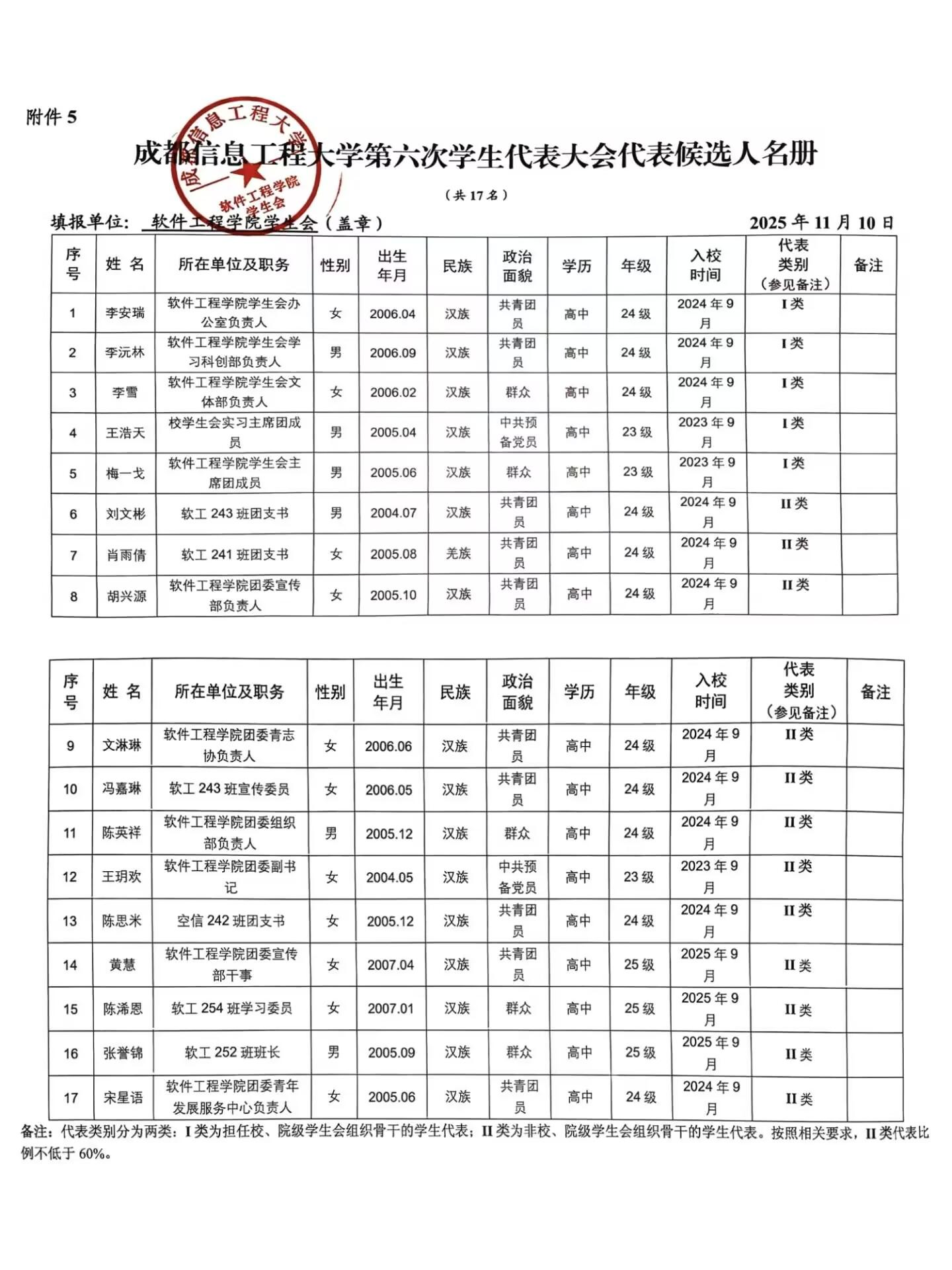 根据《关于做好成都信息工程大学第六次学生代表大会、第六次研究生代表大会筹备工作的通知》要求,经班级民主推荐 、学院资格审查与遴选,确定 李安瑞 等 17 名同学为成都信息工程大学第六次学生代表大会代表人选(具体名单见附件)。