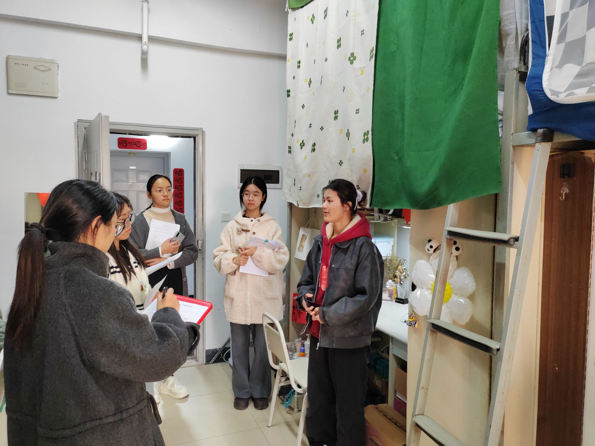 11月20日下午,评审团按照“德育风尚、智育氛围、体育活力、美育创意、劳动整洁”五大维度,对参赛寝室进行实地打分。评审过程中,同学们热情地向评审团介绍寝室的布置理念与相处故事,每一个细节都饱含着对“家”的热爱。