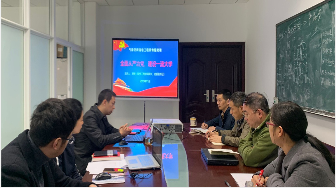 11月7日上午,气象空间信息工程系党支部“不忘初心、牢记使命”主题教育专题党课在双中心A507会议室举行,学院党委副书记、院长唐聃同志为支部全体党员讲授了题为“全面从严治党,建设一流大学”的党课,会议由支部书记王柯主持,支部全体党员参加学习。