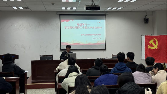 12月4日,学院研究生党支部在信达楼A502进行对党的二十届三中全会精神的专题学习,党员龙添辉同志组织全体党员深入学习贯彻习近平总书记关于全面深化改革的一系列新思想、新观点、新论断和党的二十届三中全会精神。