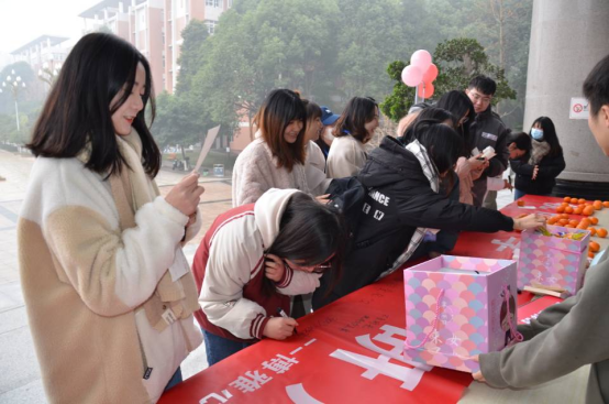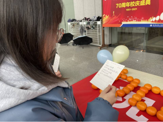 活动现场,“博雅心语”名辅导员工作室积极稳定考生心理状态,给予积极的心理暗示,小小的橘子和甜甜的糖果寓意“心想事成”和“大吉大利”,为成信学子们带来了温暖和祝愿,帮助考研学子坚定的,必胜的信念。