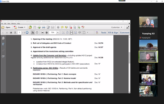 CCAT于2021年成功参与开发了2项国家标准: 产品几何技术规范(GPS)楔体第1部分:角度与斜度系列(http://std.samr.gov.cn/gb/search/gbDetailed?id= B4C32814ED898084E05397BE0A0A02E1)和产品几何技术规范(GPS)楔体第2部分:尺寸与公差标注(http://std.samr.gov.cn/gb/search/gbDetailed?id= AC9483E2A77E8EDEE05397BE0A0A9C21),为国家标准化建设做出了积极的贡献。CCAT的许源平教授、李涂鲲教授由国标委推荐于2022年2月成为国际标准化组织ISO TC/213技术委员会国际委员,并代表我国参加了2月14日-15日召开的ISO TC/213 AG12工作组的在线工作会议,审定了3项ISO国际标准,并讨论了如何开展标准文档智能化底层框架重构方面的标准建设工作,有望实现我国在几何公差领域国际标准开发与制定的突破。