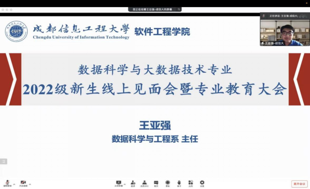 17下午数据科学与大数据技术专业的线上见面会正式开始,首先王亚强老师和罗飞老师对全体22级数据科学与大数据技术专业新生表示欢迎,随后王亚强老师讲解了该专业的概况、师资力量,紧接着以华西医学院临床试验为典例,讲述了本专业在各方面的学习价值以及重要性。王老师鼓励新生用奋斗成就梦想,奋斗本身就是一种幸福的理念,激励每位新生要志存高远,规划好时间,从而才能学好专业知识。最后,两位老师向新生致以四年美好大学生活的祝福。