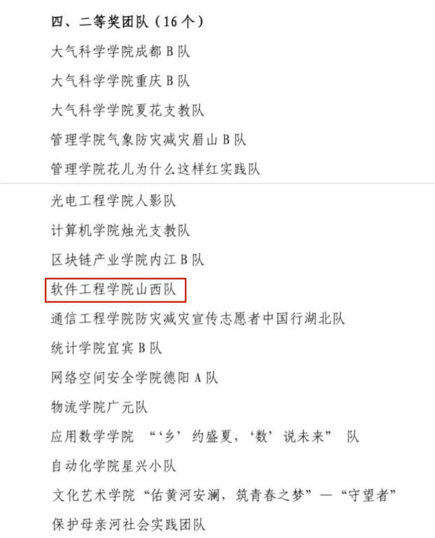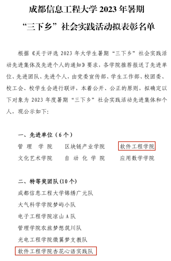 近日,由党委宣传部、学生工作部、校团委、校工会、校学生会联评确定的成都信息工程大学2023年暑期“三下乡”社会实践活动表彰名单中,我院荣获“先进单位”称号,“杏花心语”实践队被评为“特等奖团队”,山西队被评为“二等奖团队”,指导老师张澄、万娟被授予“先进教师”称号,关胜、唐秋瑶、张力月同学被授予“先进个人”称号。