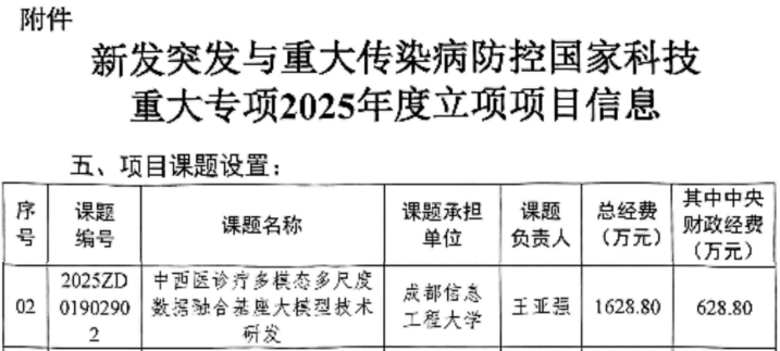 近日,国家卫生健康委正式发布《新发突发与重大传染病防控国家科技重大专项2025年度立项项目立项通知》。我院作为牵头单位,成功获批“中西医诊疗多模态多尺度数据融合基座大模型技术研发”课题。