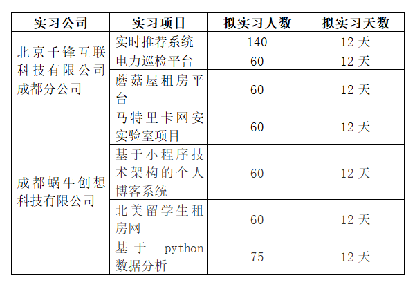 2023年“bw西汉姆联2020级本科学生集中毕业实习项目”,经学院对入围的两家公司:北京千锋互联科技有限公司成都分公司、成都蜗牛创想科技有限公司提交的实习方案从格式、方案内容设计与专业的契合度、方案实施可行性等方面进行了评审,遴选出符合学院此次毕业实习要求的实习项目共计7个。实习项目相关信息如下:
