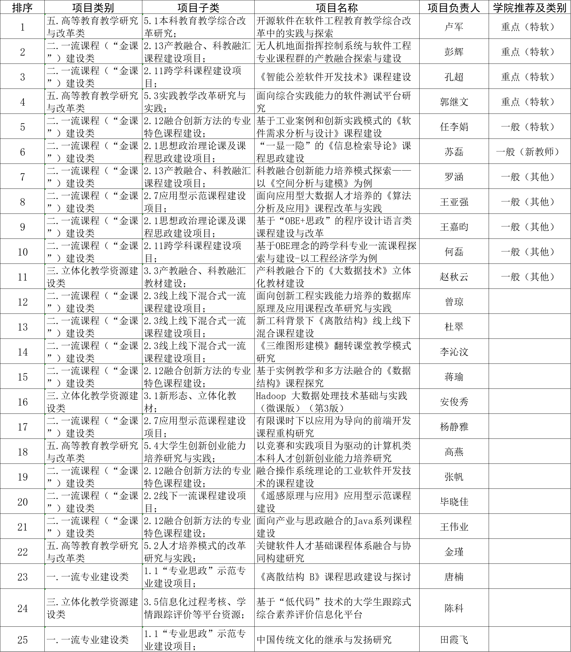 根据《关于开展2024年本科教育教学研究与改革项目暨本科教学工程项目申报工作的通知》(教务发【2023】25号)文件要求,经教师本人申请,学院“2024年本科教育教学研究与改革项目暨本科教学工程项目评审小组”结合学院党政联席会确定的指导原则对申报项目进行了综合排序及推荐,具体情况如下: