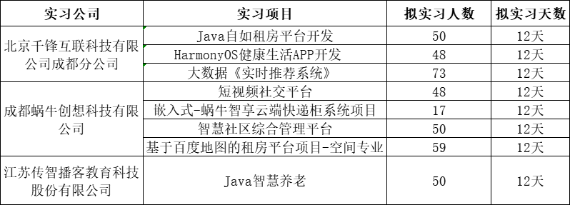 2024年“bw西汉姆联2021级本科学生集中毕业实习项目”,经学院比选打分、集中评审后,本次共有三家公司入围:北京千锋互联科技有限公司成都分公司、成都蜗牛创想科技有限公司、江苏传智播客教育科技有限公司。根据公司提交的实习方案,学院评审小组从资料完整度、方案内容设计与专业的契合度、方案实施可行性等方面进行了审核,遴选出符合学院此次毕业实习要求的实习项目共计9个。实习项目相关信息如下: