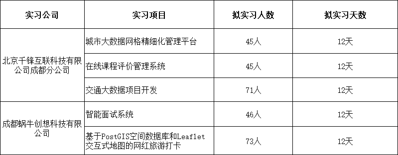 2025年“bw西汉姆联2022级本科学生集中毕业实习项目”,经学院比选打分、集中评审后,本次共有两家公司入围:北京千锋互联科技有限公司成都分公司、成都蜗牛创想科技有限公司。根据公司提交的实习方案,学院评审小组从资料完整度、方案内容设计与专业的契合度、方案实施可行性等方面进行了审核,遴选出符合学院此次毕业实习要求的实习项目共计5个。实习项目相关信息如下: