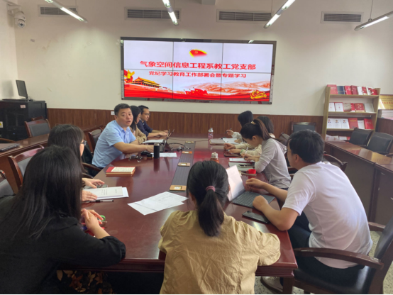 4月19日上午,气象空间信息工程系教工党支部在信达楼B505开展党纪学习教育工作部署会暨专题学习,会议由支部书记何磊主持。