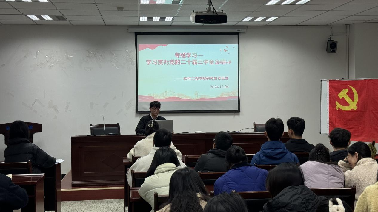 2024年12月4日,我院研究生党支部在信达楼A502进行对党的二十届三中全会精神的专题学习,党员龙添辉同志组织全体党员深入学习贯彻习近平总书记关于全面深化改革的一系列新思想、新观点、新论断和党的二十届三中全会精神。
