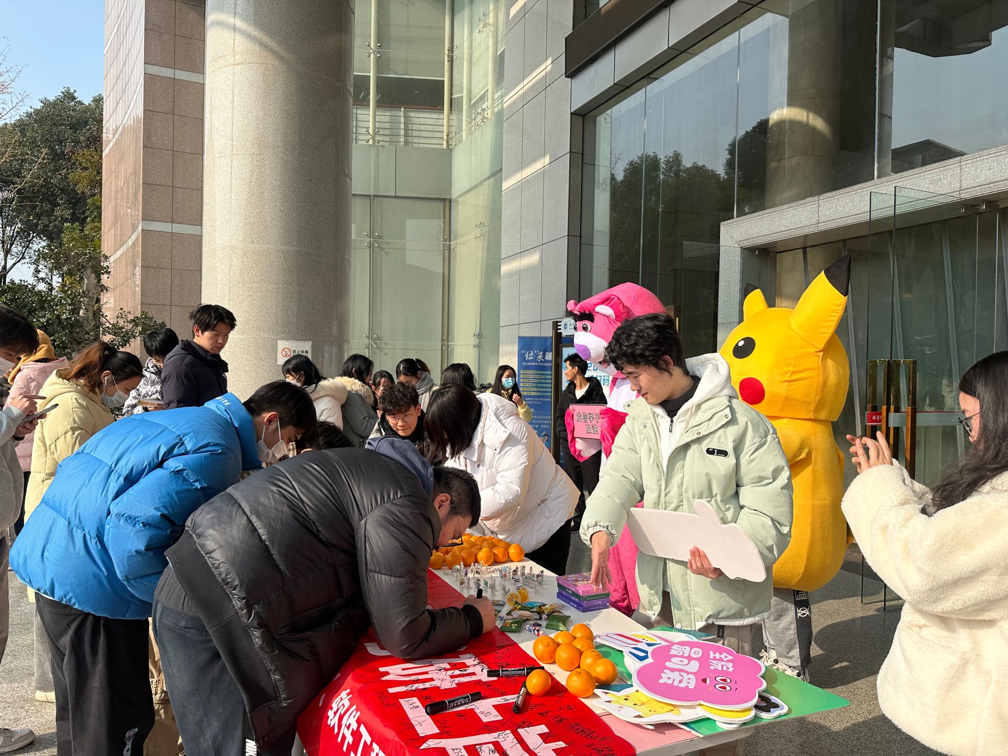 活动当日,现场被暖阳包裹,象征考研学子的考研之路必定暖阳相伴,考研学子纷纷在横幅上写下自己心之所念,拿着祝福小板子和玩偶合照。